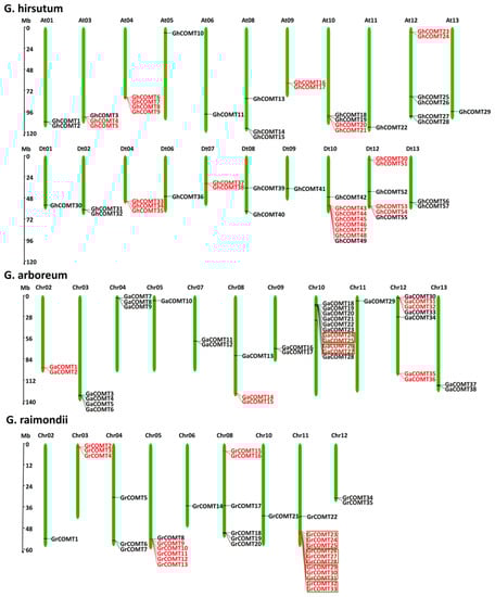 Chromosomal locations of COMT gene family in G. hirsutum, G. arboreum and G. raimondii. The chromosome name is above each chromosome, and the red lines on the chromosome are tandem genes. The green box separates multiple sets of tandem genes.