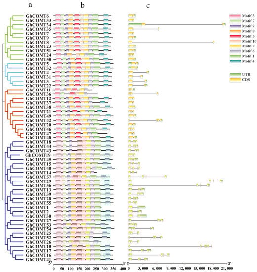 Phylogenetic relationship, conversed protein motif analysis and gene structure predictions of GhCOMT family: (a) a neighbor-joining phylogenetic tree. (b) Conversed protein motifs of the amino acid sequences of GhCOMTs. (c) Gene structure analysis of GhCOMT genes.