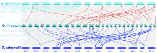 Collinearity of COMT genes between G. hirsutum, G. arboretum and G. raimondii. The synteny of COMTs between G. hirsutum and G. arboreum labeled with red lines and the synteny of COMTs between G. hirsutum and G. raimondii labeled with blue lines.