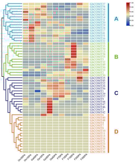 Gene expression patterns are usually related to their functions. A transcriptome analysis of the GhCOMTs was performed using RNA-seq data for different stages of cotton ovule and fiber development (Table S1). The COMT of upland cotton can be clustered into A, B, C and D groups according to their expression in different fiber development stages (Figure 5). In group A, genes were highly expressed in the early stage of fiber development (from −3 DPA to 1 DPA). Group B played a role in the period of secondary wall thickening (10 DPA–30 DPA), and it was the period of lignin synthesis. In group C, COMT plays a role in 3 DPA–7 DPA. In group D, there were 14 COMTs that did not express at any stage of fiber development.