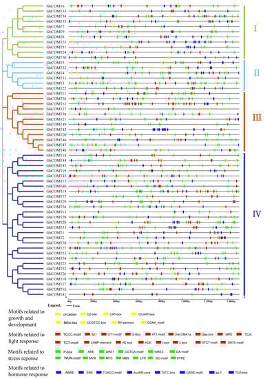 Predicted cis-elements in the promoter regions of GhCOMT genes. GhCOMTs were divided into I, Ⅱ, Ⅲ and Ⅳ according to the protein sequences. Motif names were showed below with different colors.