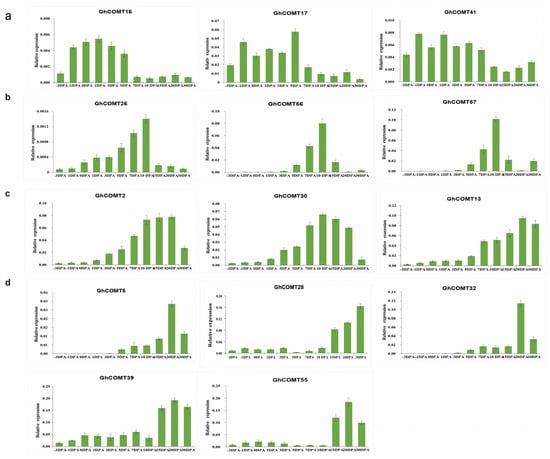 According to expression in the transcriptome analysis (Figure 7), 14 GhCOMTs were selected for qRT-PCR at different fiber development stages. In Figure 5, GhCOMT16, GhCOMT17 and GhCOMT41 were in Group A, and their expressions were higher in the initial stage and earlier elongation stage of fiber development. On the other hand, GhCOMT26, GhCOMT56 and GhCOMT57 were in Group C, and their expressions were higher in the elongation stage of fiber development. In addition, GhCOMT2, GhCOMT5, GhCOMT13, GhCOMT28, GhCOMT30, GhCOMT32, GhCOMT39 and GhCOMT55 were in group B. The expressions of GhCOMT5, GhCOMT28, GhCOMT32, GhCOMT39 and GhCOMT55 were higher in the secondary wall thickening stage, while the expressions of GhCOMT2, GhCOMT13 and GhCOMT30 were as higher in the elongation stage and secondary wall thickening stage.