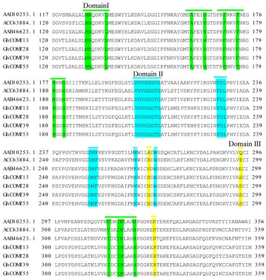 GhCOMT13, GhCOMT28, GhCOMT39 and GhCOM55 multiple sequence alignment was performed with other related to lignin COMT. Domain Ⅰ (Green): substrate binding site; Domain Ⅱ (Blue): SAM binding site; Domain Ⅲ (Yellow): catalytic residues.