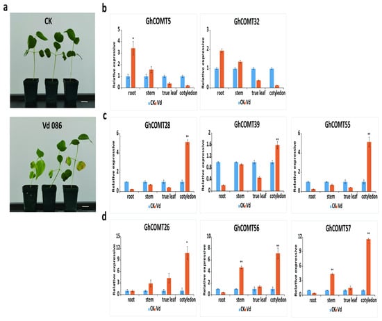 (a) Disease symptoms of cotton plants after 7 days inoculation with V. dahliae strain Vd086. Bar = 1 cm. (b–d) shows that the expression patterns of 8 GhCOMTs at different organs with V. dahliae and CK(mock). The values are standardized. GhUBQ7 (DQ116441) was used as the internal control. Each experiment was performed in three biological replicates, and the error bars represent mean ± SD; n = 3. * p < 0.05; ** p < 0.01.