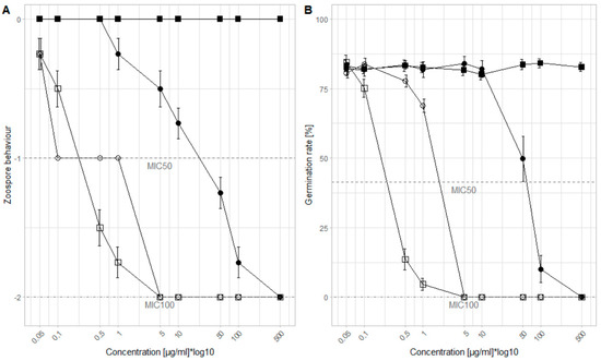 Results of the microtiter assays, (A) zoospore behavior and (B) germination rate of sporangia (n = 16): Control (■), Cu-fungicide (□), WLD (●), WBD (○). Three behavior categories were defined to measure the zoospore behavior: (0) normal zoospore motion; (−1) no or unusual zoospore motion; (−2) no zoospore release. Nine concentrations of each extract were selected to examine the inhibition efficacy: 0.05; 0.1; 0.5; 1; 5; 10; 50; 100; and 500 µg/mL. Y-axis is log10 transformed to generate a more coherent plot. MIC50 is indicated as a dashed line, MIC100 as a dotted-dashed line.