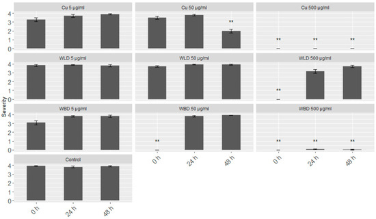 Merged (cv. ‘Müller–Thurgau’ and ‘Pinot Noir’) results of the leaf disc assays based on infection severity: (0) no sporulation, (1) minimal sporulation, (2) low sporulation, (3) medium sporulation, (4) full sporulation. For each treatment, three concentrations were tested (5, 50 and 500 µg/mL) and three different time points of sporangia inoculation (0, 24, and 48 h after spraying). Treatments were Cu-fungicide (Cu), WLD, WBD and control. Welch’s anova and Games–Howell test for multiple comparison: Significant differences of the treatments compared to control; ** p < 0.001; n = 48.