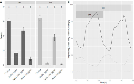 (A) Merged (cv. ‘Müller–Thurgau’ and ‘Pinot Noir’) results of the leaf disc assay conducted with seedling plants under semi-controlled conditions. Shown is the infection severity of leaf discs treated either with water (control), Cu-fungicide 500 µg/mL, WLD 1000 µg/mL or WBD 500 µg/mL: (0) no sporulation, (1) minimal sporulation, (2) low sporulation, (3) medium sporulation, (4) full sporulation. Welch’s anova and Games–Howell test for multiple comparison: Different letters indicate significant (p < 0.05; n = 72) differences between groups. (B) Weather conditions during the time of the experiment, when seedlings were placed in the field: Dashed line = rain, dotted line = temperature, solid line = relative humidity.