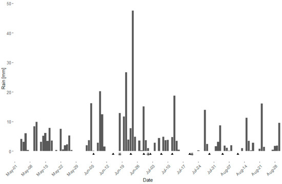 Daily rainfall (mm) during the season 2021 from May to August at the Julius Kühn-Institute facilities in Siebel-dingen, Rhineland-Palatinate, Germany. Triangles indicate date of plant protection application (∑ = 11). Asterisks indicate date of DM assessment (∑ = 3).
