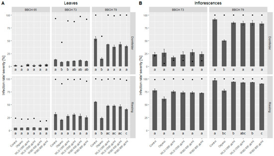 Mean DM infection rate (dots) and severity (bars) in the two trial fields, ‘Dornfelder’ and ‘Riesling’. (A) Leaves were assessed on three phenological stages (BBCH 65, BBCH 73, BBCH 79) and (B) inflorescences on two phenological stages (BBCH 73, BBCH 79). Welch’s anova and Games–Howell test for multiple comparison: Different letters indicate significant differences in mean infection severity; p < 0.05; ‘Dornfelder’: n = 5, ‘Riesling’: n = 4.