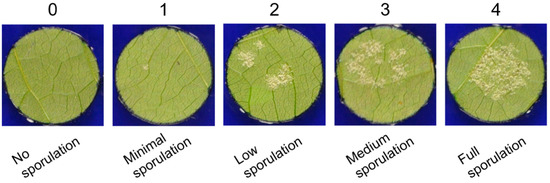 As descripted above for the in vitro assays, three dilutions for each extract were made: 5, 50, 500 µg/mL. The extracts were sprayed horizontally on the leaf discs by using an application chamber (SprayLab Epilogic, Schachtner Gerätetechnik, Ludwigsburg, Germany) with following settings: 32 cm distance from leaf discs to nozzle, 3.0 bar pressure, 2.5 km/h spraying device pace, 300 L/ha application rate. Control leaf discs were sprayed with H2Odd containing DMSO (the same amount as for the extract dilutions) and for comparison, a Cu-based fungicide (Funguran® progress, Biofa GmbH, Münsigen, Germany) with the same concentrations as the extracts was applied. After application of each treatment, the spraying device was cleaned with H2Odd. The sprayed leaf discs were arranged on a 0.8% H2Odd-agar plate (Agar-Agar, Carl Roth, Karlsruhe, Germany) with abaxial site up and inoculated with a 70 µL drop of a sporangia suspension (20,000–30,000 sporangia/mL). Subsequently, the agar plates with the inoculated leaf discs were incubated in the climate chamber at the same conditions as for the pathogen cultivation. A total of 24 h after inoculation, the drops were removed from the leaf discs with a vacuum device (Mini-Vac, Axon Lab AG, Stuttgart, Germany). Then, plates were put back to the climate chamber for further incubation. The full sporangiophore formation was noticed about 10 days after inoculation. At this time, the infection severity on the leaf discs was evaluated based on five severity categories: (0) no sporulation; (1) minimal sporulation; (2) low sporulation; (3) medium sporulation (4) full sporulation (Figure 6). In order to investigate the temporal protective effect of the extracts, the sprayed leaf discs were inoculated with sporangia either directly after the treatment (0 h), 24 h after the treatment or 48 h after the treatment. For each time point, the experiment was repeated four times. Statistical analysis of the data was done with RStudio [65]. With Welch’s anova and Games–Howell test for multiple comparison, a non-parametric approach was chosen for statistical analysis since the obtained data (infection severity) were not normally distributed and showed heteroscedasticity.
