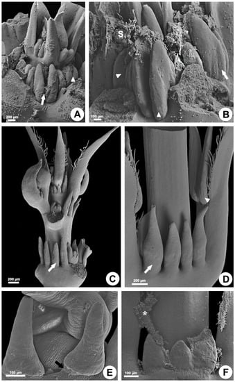 - Machado, S.R.; Paleari, L.M.; Paiva, E.A.S.; Rodrigues, T.M. Colleters on the inflorescence axis of Croton glandulosus (Euphorbiaceae): Structural and functional characterization. Int. J. Plant Sci. 2015, 176, 86–93. [Google Scholar] [CrossRef] [Green Version]