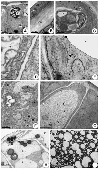 Ultrastructure of the colleter secretory cells of Blepharodon bicuspidatum (A,B,D–F,H) and Allamanda shottii (C,G,I). Transmission electron microscopy. (A,C) Vacuoles with heterogenous content. (B) Pectin projections from the cell wall (CW) into the cuticle (Cu). (D) RER in parietal position. (E) Dictyosome vesicles being directed to the plasma membrane. (F) Plastids with starch grains and mitochondria. (G) Central vacuole filled with secretion. (H) Vesicles with polysaccharides detected using PATAg test (asterisk) and oil bodies (OB). (I) Detection of lipids with imidazole-osmium tetroxide test in the secretion on the colleter. Arrow = pectin projections within cuticle; Arrowhead = dictyosome; M = mitochondrion; P = plastid; RER = rough endoplasmic reticulum; V = vacuole.