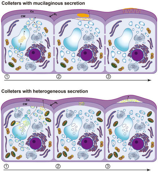 The granulocrine secretion is the main mechanism of exudation observed in colleters. Secretory vesicles and vacuoles which fuse with plasma membrane releasing the secretion into the periplasmic space occur in all colleters described to date, as observed in Apocynaceae, Bromeliaceae, Caryocaraceae, Celastraceae, Clusiaceae, Euphorbiaceae, Fabaceae, Lecythidaceae, and Rubiaceae [5,27,29,30,31,33,34,39,40,41]. Additionally, some lipids may also be directly released through the plasma membrane without being packed in vesicles (eccrine mechanism) in Allamanda and Blepharodon. Similarly, eccrine secretion has been observed in colleters of Tabernaemontana, Croton, and some Rubiaceae [5,29,40].