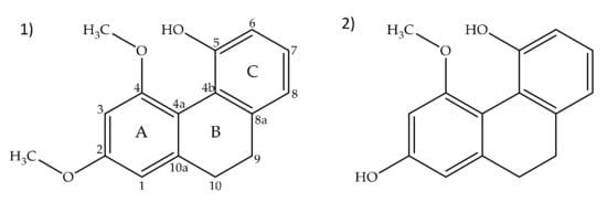 - Fisch, M.H.; Flick, B.H.; Arditti, J. Structure and antifungal activity of hircinol, loroglossol and orchinol. Phytochemistry 1973, 12, 437–441. [Google Scholar] [CrossRef] [Green Version]