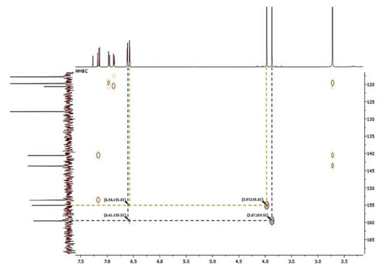 Compound 1 was obtained as a colorless amorphous powder. HPLC-MS showed a molecular ion at m/z 257.1181 [M + H]+ (calcd. for C16H16O3+[H]+, m/z 257.1172). The 1H-NMR spectrum of 1 (Figure 2) showed characteristic signals for a 9,10-dihydrophenanthrene: 4 aliphatic protons H-9 and H-10 (δ = 2.72 ppm, br s, 4H), which confirm the absence of double bond between C-9 and C-10; the coupling between H-1 and H-3 protons (dd, J = 2.5 Hz) for a meta-di-substituted aromatic ring, highlighted the presence of two methoxy-substituents on C-2 and C-4 (δC = 159.5 and 155.0 ppm, respectively) (Figure 3). The HMBC correlations of H-1 (δ = 6.62 ppm) with the carbons C-2 (δ = 159.5 ppm) and the correlation of C-2 with methoxy protons -OCH3 at 3.97 ppm established the methoxy group on C-2 carbon (Figure 4). The presence of other substituents (a methoxy group on C-4) was confirmed by correlations between H-3 and C-4, and C-4 with methoxy protons at 3.87 ppm (Figure 4). The aromatic signals between 6.88 and 7.16 ppm showed a mono-substituted (hydroxy group) on C-5. The values of chemical shift (δC) presented in literature were registered only in CD3OD [], but our correct structural evaluation of 1 has been confirmed by 2D-NMR and HPLC-MS spectra.