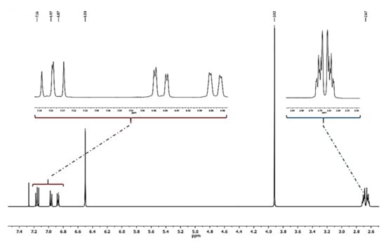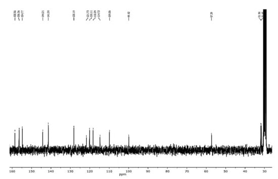 HPLC-MS of amorphous powder compound 2 showed a molecular ion at m/z 243.0948 [M + H]+ (calcd. for [M + H]+, m/z 243.1016), which agreed with the molecular formula C15H14O3. It is a saturated phenanthrene in position C9-C10 (31.7 and 31.9 ppm, respectively) with two hydroxyl groups in position C-2 (158.6 ppm) and C-5 (154.8 ppm) and a single methoxy group in position C-4 (156.4 ppm). The absence of double bond was confirmed by a resonance system at 2.67 ppm (4H, m, H2-9,-10), while the presence of a single methoxy-group was verified from signal at 3.92 ppm (3H, s, -OCH3). The C ring showed the same proton signals of compound 1 (Figure 5 and Figure 6). The impossibility of exploiting the HMBC correlations (due to the overlapping between the H-1 and H-3 protons) did not allow the exact identification of the molecule, which was verified by exact comparison with the literature [].