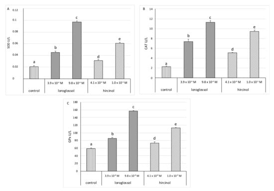 Effect of the loroglossol and hircinol on activities of antioxidant enzymes in polymorphonuclear cells. (A) Superoxide dismutase; (B) catalase; (C) glutathione peroxidase. Data were presented as mean and standard error and they were analyzed with a paired t-test. Bars not accompanied by the same letter were significantly different at p < 0.05.