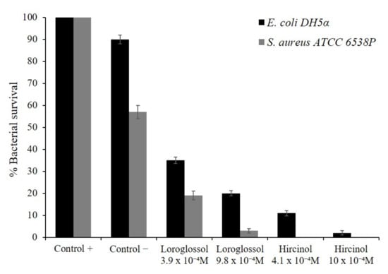 Antibacterial activity of loroglossol and hircinol evaluated by colony count assay, against E. coli DH5α and S. aureus ATCC 6538P at different concentrations. Untreated cells represent positive control while bacterial cells with dimethyl sulfoxide represent the negative one. Each bar is the average of three different experiments (p value is <0.05).