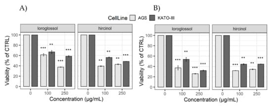 Effect of loroglossol and hircinol on cell proliferation. AGS and KATO-III cells were treated for 24 h (A) and for 48 h (B). Cell proliferation was determined by MTS assay. Data were expressed as % of vehicle control viability. Data were presented as mean and standard error of three individual experiments and analyzed with one sample-t test. ** p < 0.005; *** p ≤ 0.0001.