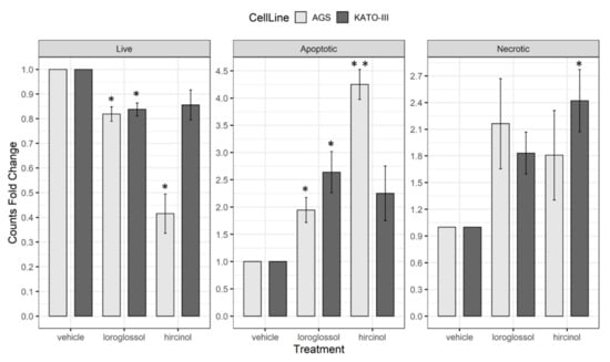 Further characterization of anti-proliferative effects of loroglossol and hircinol were assessed through flow cytometry analyses; in particular, it was taken in consideration whether treated cells underwent apoptotic cell death. Based on MTS results, apoptosis was evaluated after 48 h of exposure to 100 µg/mL (3.9–4.1 × 10−4 M) of both compounds. As showed in Figure 10, a decreased number of live cells was observed in both cell lines loroglossol, AGS: 0.82 ± 0.03, p = 0.03 and KATO-III 0.84 ± 0.03, p = 0.03; hircinol, AGS: 0.42 ± 0.8, p = 0.04 and KATO-III 0.86 ± 0.06, p = 0.16).