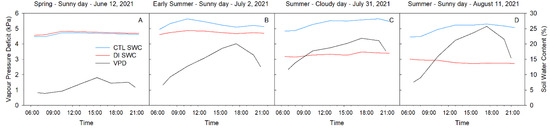 Diurnal patterns of mean volumetric soil water content (SWC) and vapor pressure deficit (VPD) for four representative days (12 June (A), 2 July (B), 31 July (C), 11 August (D)) during 2021 season.