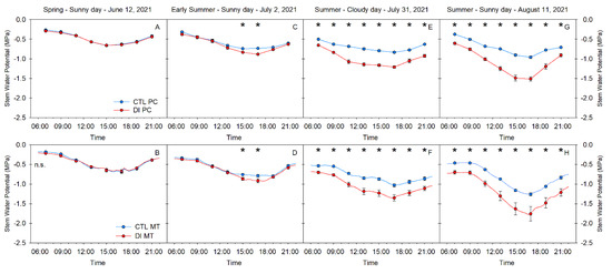 Diurnal patterns of stem water potential measured with the pressure chamber (PC) (A,C,E,G) or with the microtensiometer (MT) (B,D,F,H) for control (CTL, blue) and deficit-irrigated (DI, red) trees on four representative days (12 June, 2 July, 31 July, 11 August) during the 2021 growing season (N = 6). Asterisks indicate statistically significant differences between irrigation treatments according to ANOVA (p ≤ 0.05).