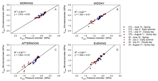 Relationship between stem water potential measured with the pressure chamber and the microtensiometers for control trees (CTL, blue) and deficit irrigated trees (DI, red) in the morning (A), midday (B), afternoon (C), and evening (D) of four representative days (12 June (circle), 2 July (square), 31 July (triangle), 11 August (diamond)) during 2021 season. (*** p < 0.001).