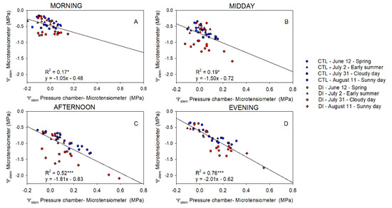 The linear relationship between stem water potential measured with the microtensiometers and the difference between the pressure chamber and the microtensiometers for control trees (CTL, blue) and deficit irrigated trees (DI, red) in the morning (A), midday (B), afternoon (C), and evening (D) of four representative days (12 June (circle), 2 July (square), 31 July (triangle), 11 August (diamond)) during 2021 season. (* p < 0.05, *** p < 0.001).
