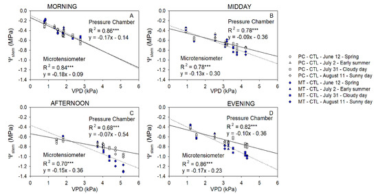 Relationship between the stem water potential measured with the microtensiometers (MT, blue) and the pressure chamber (PC, white) with the vapor pressure deficit (VPD) for control trees (CTL) in the morning (A), midday (B), afternoon (C), and evening (D) of four representative days (12 June (circle), 2 July (square), 31 July (triangle), 11 August (diamond)) during 2021 season. (*** p < 0.001).
