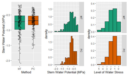Pooled data indicated that microtensiometers resulted in a greater dispersion of Ψstem, with values that ranged between −0.2 and −2.1 MPa, while Ψstem measured with the pressure chamber ranged between −0.3 and −1.6 MPa (Figure 6). Similar results were observed when the frequency distribution of measured Ψstem values was calculated for each method. However, when the Ψstem values were translated into values according to a scale of water stress, those differences in the distribution of the data decreased. This new distribution exhibited that the differences in Ψstem between methods generally did not imply a different level of water stress for the tree (Figure 6). These results highlight the applicability of both methods and relativize the differences found between them.