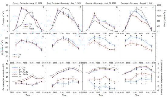 Diurnal course of photosynthetic photon flux density (PPFD), net photosynthesis (Pn) (A,D,G,J), stomatal conductance (Gs) (B,E,H,K), canopy temperature (Tc), air temperature (Ta), and the difference between Tc and Ta (Tc-Ta) (C,F,I,L) for control (CTL, blue) trees and deficit-irrigated (DI, red) trees on four representative days (12 June, 2 July, 31 July, 11 August) during the 2021 season (N = 6). Asterisks indicate statistically significant differences between irrigation treatments according to ANOVA (p ≤ 0.05).