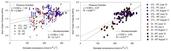 Relationship between the stem water potential measured with the microtensiometers (MT) and the pressure chamber (PC) with the stomatal conductance for control trees (CTL, blue) and deficit-irrigated trees (DI, red) of four representative days (12 June (circle), 2 July (square), 31 July (triangle), 11 August (diamond)) (A) and three representative days (12 June (circle), 2 July (square), 11 August (diamond)) from 10:30 to 15:30 h during 2021 season (B). (*** p < 0.001).