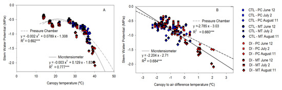 Relationship between stem water potential measured with the microtensiometers (MT) and the pressure chamber (PC), and canopy temperature (A) and canopy-to-air temperature (B) for control trees (CTL, blue) and deficit-irrigated trees (DI, red) of three representative days (12 June (circle), 2 July (square), 11 August (diamond)) from 10:30 to 15:30 h during 2021 season. (*** p < 0.001).