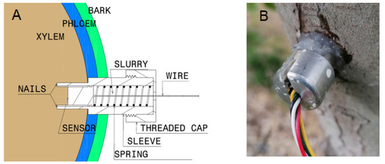 Microtensiometer installation scheme (A) and real sensor installed into the tree (B).