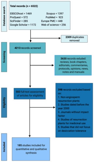 We used a multi–step protocol called Preferred Reporting Items for Systematic reviews and Meta–Analyses (PRISMA) to collate publications for this systematic review [27,28]. A literature search was conducted using EBSCOhost, Scopus, google scholar, ProQuest, PubMed, SciFinder and Europe PubMed Central (Europe PMC). The search was conducted in January 2021 using wildcards including “resurrection plants” or “desiccation tolerant plants”, “desiccation stress” or “water deficit conditions” and “dehydration and rehydration”. There were no filters applied in the search. Additional research articles that matched our search criteria were obtained from reference lists of the published reviews and original articles. This literature search generated a total of 6522 studies and all citations were exported to EndNote 20.1 for macOS.