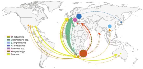 Resurrection plants have received growing research attention in the past 20 years and a handful of species have emerged as models for understanding desiccation tolerance. Among these are the monocot resurrection plants Eragrostis nindensis, Oropetium thomaeum, Sporobolus stapfianus, Tripogon loliiformis, Xerophyta humilis and Xerophyta viscosa* (multiple populations were later reclassified as X. schlechteri) and the dicots Boea hygrometrica, Craterostigma plantagineum, Craterostigma pumilum, Craterostigma wilmsii, Haberlea rhodopensis, Lindernia brevidens, Myrothamnus flabellifolia, Ramonda serbica and Ramonda nathaliae. These species are distributed across the globe, with representatives found in both the Southern and Northern hemispheres, but the highest density of resurrection plants occurs in arid tropical and subtropical regions in Africa, South America and Australia. Fewer resurrection plants are found in the Northern hemisphere, but B. hygrometrica and Paraboea rufescens occur in Asia, and H. rhodopensis and Ramonda species are endemic to Europe [6,7,8]. The ability to tolerate desiccation has enabled resurrection plants to thrive in extremely arid microclimatic conditions where other plants perish. Resurrection plants grow predominantly in sites with shallow rocky soil, high temperatures, and limited rainfall [5,9].