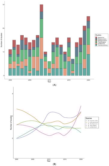 Data were extracted and arranged in Microsoft Excel 2019 and analyzed in R version 1.2.5033 (R Studio Inc., Boston, MA, USA, 2019). We computed the number of studies conducted on each species annually, if they were native, collaborative or international study, and what the methodologies were. The R Packages gplots, ggplot2 and plotly were used for data visualization.