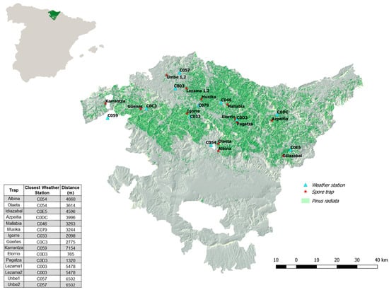 Location of spore traps (red) and weather stations (blue) in the Basque Country. Information about the distance between them is included in the bottom left of the image. The distribution of Pinus radiata appears in green on the map. Map with the location of the Basque Country in Spain is shown in the upper left corner of the figure.