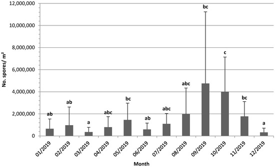 Mean of the number of spores per square meter per day in all trap locations during the assay period. Error bars indicate the standard error. The months marked with the same letters are not significantly different (p > 0.05).