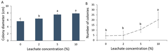 Growth and sporulation of Fusarium oxysporum f. sp. radicis-lycopersici (Forl) at 0, 2, 5, and 10% biosolid leachate concentrations in PDA. (A) Mean colony diameter; (B) Mean sporulation. Different letters indicate statistically significant differences between the treatments according to Tukey’s post hoc test (p < 0.05).