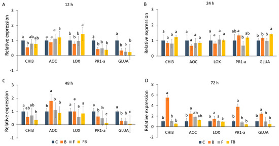 (A–D) Relative gene expression analyses of defense-related genes GLUA, CHI3, PR1-a, LOX, and AOC, in tomato plant leaves in (A) 12 h, (B) 24 h, (C) 48 h, and (D) 72 h post inoculation in control (C), biosolid−enriched treatment (B), Forl inoculation (F), and Forl inoculation with biosolid application (FB). Different letters indicate statistically significant differences between the treatments according to Tukey’s post hoc test (p < 0.05).