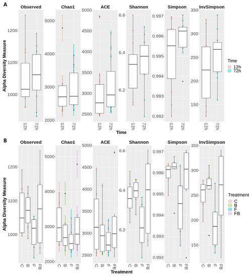 Boxplot demonstrating the range and the distribution of the of OTUs, evaluated using the α-diversity indices observed richness, Chao1, ACE, Shannon, Simpson, and InvSimpson, (A) 12 and 72 h after inoculation with Fusarium oxysporum f. sp. radicis-lycopersici; (B) for the treatments for the treatments control (C), biosolid−enriched treatment (B), Forl inoculation (F), and Forl inoculation with biosolid application (FB). Values represent the pooled mean of three replicates.