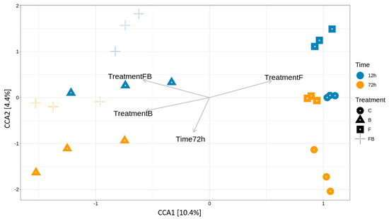 Canonical correspondence analysis (CCA) of the relative variance of OTUs in the soil samples subjected to the different control (C), biosolid−enriched treatment (B), Forl inoculation (F), and Forl inoculation with biosolid application (FB) treatments at 12 and 72 h. The biplots present the effect of biosolid application to the bacterial community abundance in the treatments with or without fungal inoculum at two different timepoints.