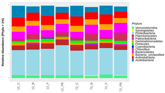 Classification of bacterial phyla based on relative abundance at rate greater than 1%, for the control (C), biosolid−enriched treatment (B), Forl inoculation (F), and Forl inoculation with biosolid application (FB) treatments, at 12 and 72 h after inoculation with Fusarium oxysporum f. sp. radices-lycopersici. The different phyla are depicted with different colors. Value is the pooled mean of three replicates.