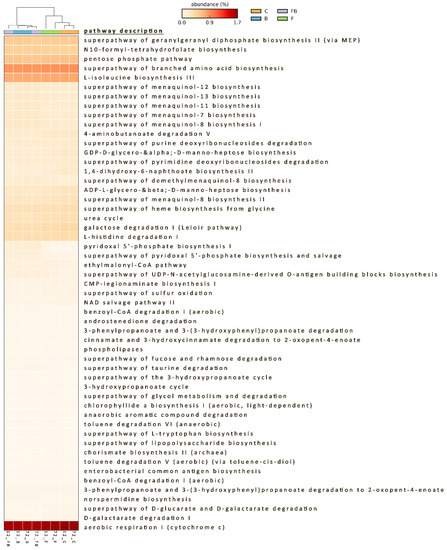 The functional potential encoded by the soil microbial communities showed significant differences in the bacterial metabolic pathways among the treatments. The functional profiles from the 16S sequences revealed different metabolic capacity between the microbiome in biosolid-enriched and the non-biosolid-enriched soils (Figure S1), with the biosolid application explaining the 81.5% (PC1) of the functional variation and time only 12.2% (Figure S2). Out of 445 pathways, only 98 pathways passed the filter of p < 0.05 with an effect size >0.85, and 53 pathways with an effect size >0.9 (Figure 7; Table S3). Biosolid-enriched treatments B and BF showed higher abundance in sequences assigned to metabolic pathways such as carbohydrate biosynthesis (gluconeogenesis), vitamin biosynthesis (folate and vitamin B6) (Figure S3), electron carrier biosynthesis (quinol and quinone; menaquinol) (Figure S3), fermentation (pyruvate), and nucleic acid processing (Table S3). Lower abundances in sequences of B and BF treatments were attributed to pathways such as aromatic compound degradation, autotrophic CO2 fixation, CMP-sugar biosynthesis, fatty acid and lipid degradation, and nitrogen compound metabolism (Table S3). High abundance of sequences in biosolid-enriched soils with Forl inoculation (BF treatment) were also assigned to metabolic pathways of vitamin biosynthesis (folate transformations III) and pathways with lower abundance, such as aromatic compound biosynthesis (chorismate), fatty acid and lipid biosynthesis, and polysaccharide biosynthesis (Table S3).
