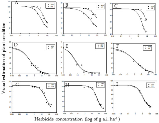 Cross-resistance to AHAS inhibitors. Plant condition was estimated visually 21 days after treatment according to a scale from 100 (healthy plants in nontreated control) to 0 (plant dead). Data were computed by nonlinear regression using Sigma-Plot version 11.01 (SPSS Inc., USA), y = y0 + . The upper asymptote (a) was normalized to 100. (A) Imazamox,(B) imazapic, (C) imazapyr, (D) trifloxysulfuron, (E) chlorsulfuron, (F) sulfosulfuron, (G) foramsulfuron, (H) propoxycarbazone-sodium, (I) pyrithiobac-sodium1.