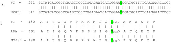 2.2. Line M2033 Contains a Novel Mutation in the AHAS1 Gene