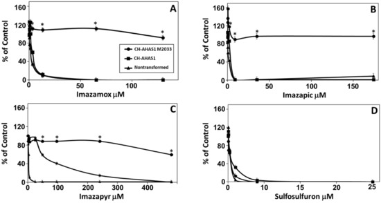 Effect of imazamox (A), imazapic (B), imazapyr (C) and sulfosulfuron (D) on root length of 10-day-old nontransformed and transgenic tobacco seedlings expressing the chickpea WT (CH-AHA1) or IMI-resistant (CH-AHA1-M2033) AHAS1 gene. Each point represents mean ± SEM of five seedlings. * indicate significant difference at p < 0.05.