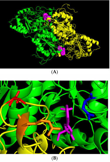 The crystal structure of Arabidopsis AHAS1 in complex with the IMI imazaquin (IQ) [13] revealed that IQ blocks the active channel of the enzyme formed by the interface of two catalytic monomers (Figure 5A). Ligand–protein contact analysis [44] showed that the IQ molecule is bound mainly by N654 (blue, nearest distance to IQ is 2.9 A), T203 (red, nearest distance to R199 is 3.4 A, probably forming a weak H-bond with the backbone oxygen of R199), and R199 (orange, nearest distance to IQ is 3.1 A) (Figure 5B). Replacement of the hydrophilic T203 by the larger hydrophobic I residue has a double effect: steric overlapping and hydrophobic–hydrophilic repulsion with R199, which is expected to strongly affect the IQ-binding pocket.