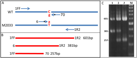 Genotype determination of WT and M2033 chickpea plants utilizing four-primers PCR amplification was performed as previously described by You et al. [53]. This PCR utilized two flanking primers: forward primer CACCACCTCCACTTTCATA (1FF) and reverse primer CTTGGGAAGCCTGGAGAG (1R2), and two allele-specific primers: forward mutant-specific primer CCCGGAGAATGATCGGgAT (6) and WT-specific primer GGTTTCTTGAAAAGCATaGG (70) (small letters represent mismatches) (Figure 7A). This PCR gave rise to amplified products of 601- and 381-bp fragments for homozygous WT plants, 601- and 257bp fragments for homozygous M2033 plants, and 601-, 381- and 257-bp fragments for heterozygous plants (Figure 7B,C).